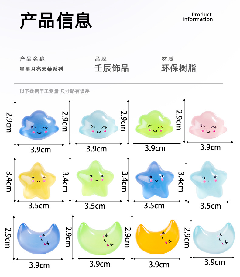 Available in multiple bright, eye-catching colors, each charm is carefully crafted with smooth edges and a polished surface, perfect for jewelry making, scrapbooking, phone case decoration, hair accessories, and more. Their compact size (stars: 3.5×3.4cm; moons & clouds: 3.9×2.9cm) makes them versatile for both small and large-scale crafts.
